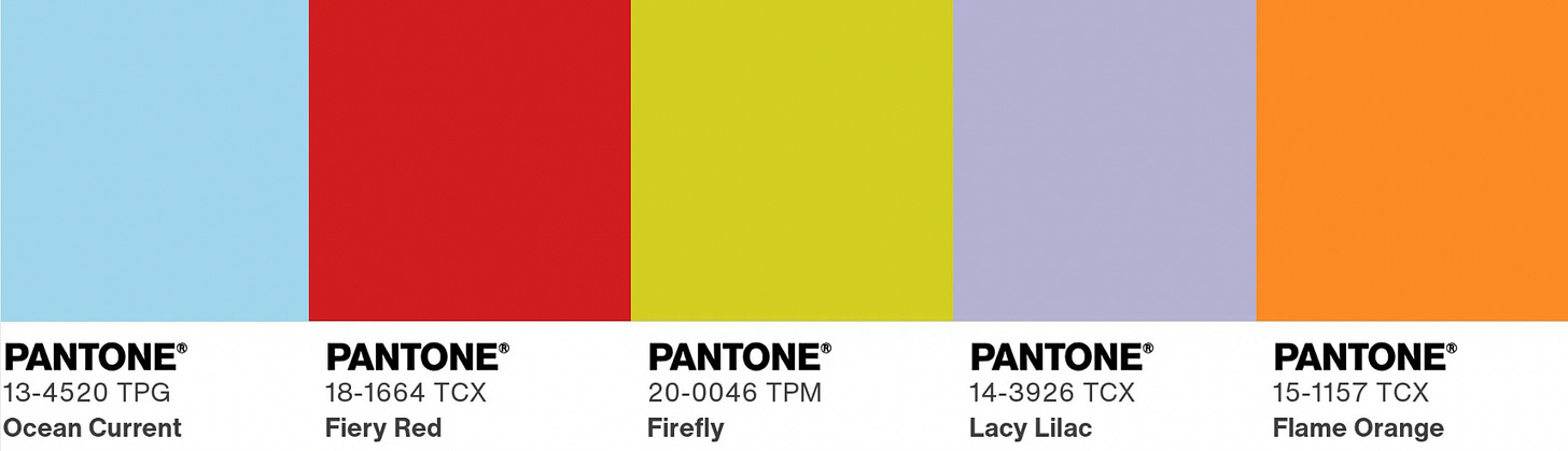 Color of the Year is by far the company’s weakest offering. Reductive to an aggregating extent, a publicity stunt. I’m not the first to say off-white was bizarre for 2026 (although maybe that’s the point!). Pale blue, lilac, chartreuse, red apple red, marty supreme orange — these are shades I see everywhere! What about you?
